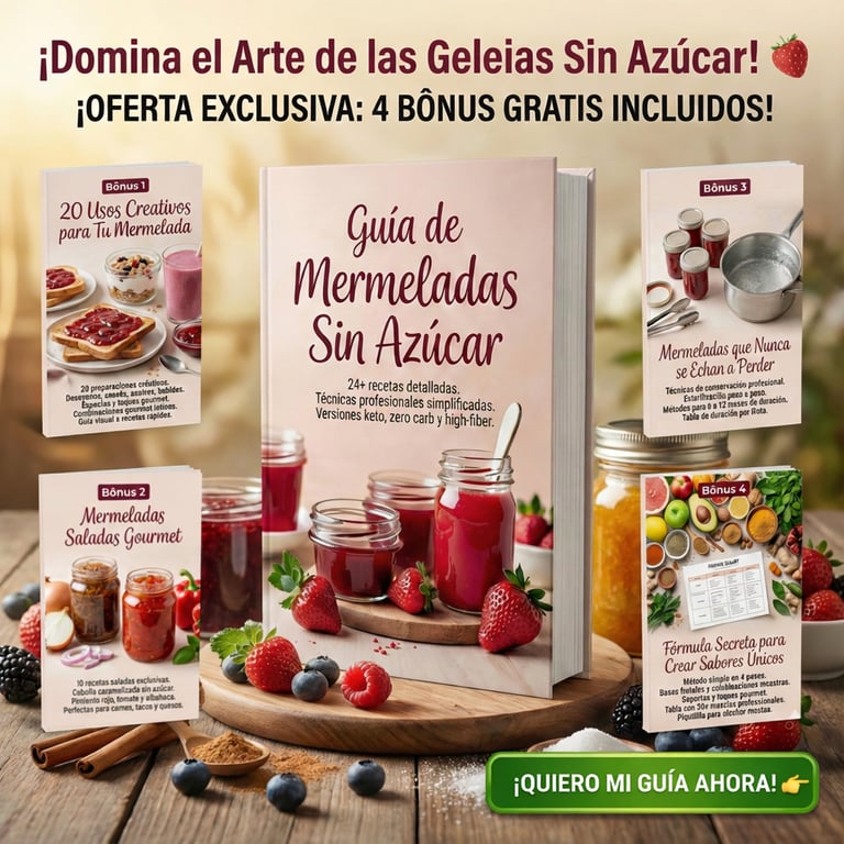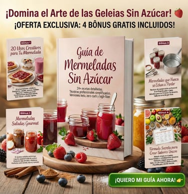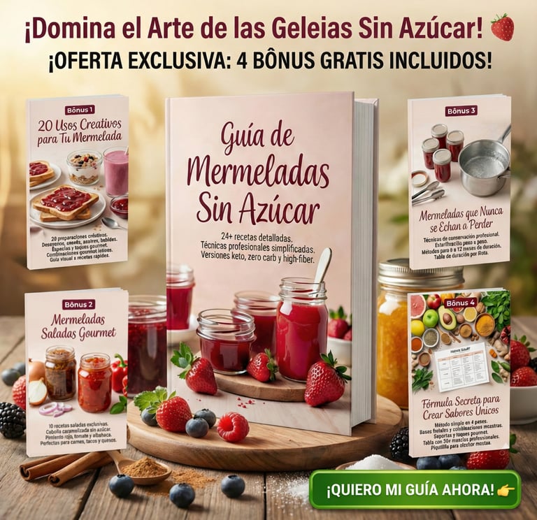 Recibirás una guía completa de mermeladas sin azúcar, compuesta por recetas detalladas paso a paso, versiones keto y bajas en carbohidratos, técnicas profesionales simplificadas y métodos seguros de conservación.